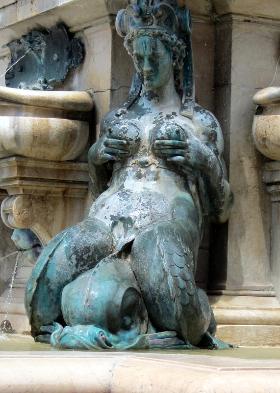 Anther interesting fact is that since he’s completely nude and, well, anatomically correct there was a bit of public shock when he was unveiled. Also, it seems that the pope thought that the original size of the, um, “member” as originally designed was perhaps too accurately sized and required that it be made smaller. I was told that the fountain has around 90 points where water emerges but the water pressure never was adequate to support all of them. (I especially liked the water that gushed from the nipples of the mermaids but haven’t seen that for years.) An interesting linguistic point is that in Italian the water gushing from various parts of the fountain are called “giochi di acqua”; “water games” in English. The only equivalent that I can think of in English would be “water features” which I think of as applying to landscaping. So there is really no English equivalent in this context unless there’s an architectural term with which I’m not familiar. In any case, during this restoration they are installing a recirculating pump system so that the water from the fountain can be seen in all of it’s originally planned glory.